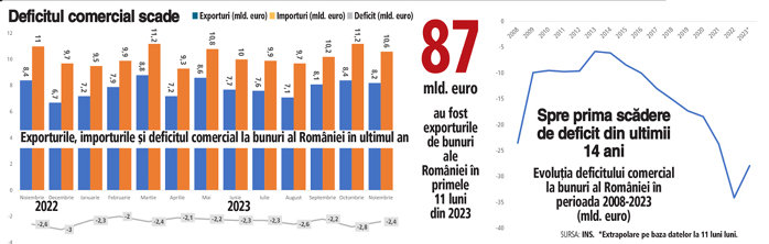 Veşti bune şi rele în acelaşi timp: deficitul comercial la bunuri scade în 2023 şi ajunge la sub 30 mld. euro, după 10 ani în care a crescut constant