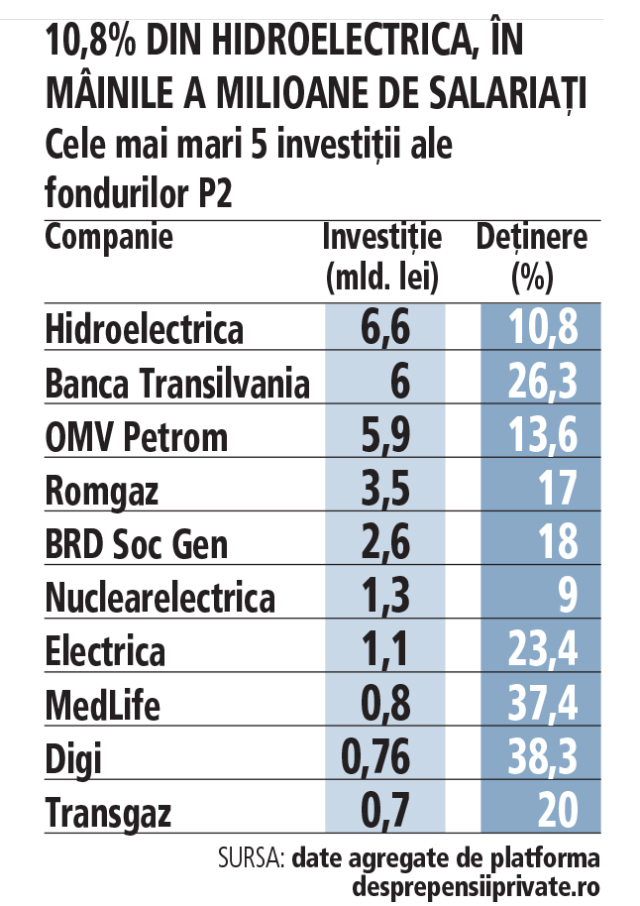 Viitorii pensionari ai României, investiţii de 6,6 mld. lei la Hidroelectrica, 6 mld. lei la Banca Transilvania, 5,9 mld. lei la OMV Petrom, 3,5 mld. lei la Romgaz prin fondurile Pilon II