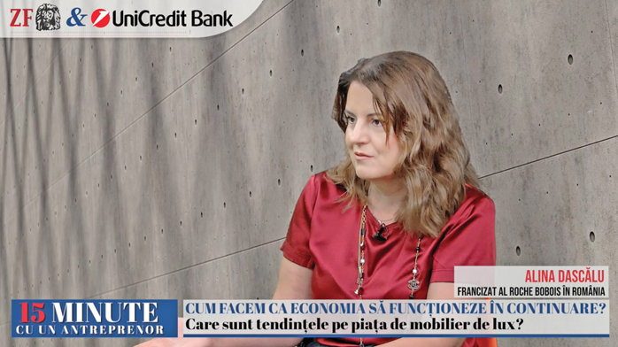 ZF 15 minute cu un antreprenor, un proiect Ziarul Financiar şi UniCredit Bank. Alina Dascălu, proprietara magazinului Roche Bobois din România: Am purtat discuţii pentru o extindere a brandului în piaţa locală, dar nu este oportună. Piaţa românească nu s-a dezvoltat încât să nu facem faţă cu un singur showroom