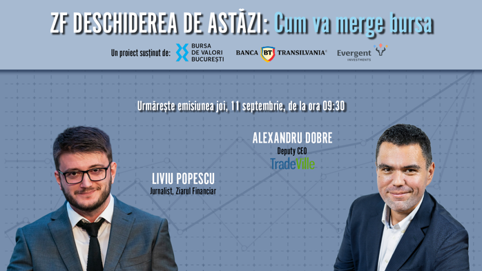 ZF DESCHIDEREA DE ASTĂZI. Cum va merge bursa. Urmăriţi joi, 11 septembrie 2025, ora 09.30 o discuţie cu Alexandru Dobre, Deputy CEO, Tradeville