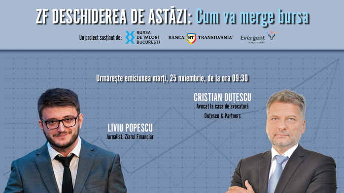 ZF DESCHIDEREA DE ASTĂZI. Cum va merge bursa. Urmăriţi marţi, 25 noiembrie 2025, ora 09.30 o discuţie cu Cristian Duţescu, casa de avocatură Duţescu & Partners
