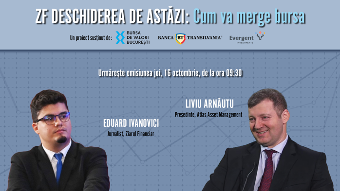 ZF DESCHIDEREA DE ASTĂZI. Cum va merge bursa. Urmăriţi o discuţie joi, 16 octombrie 2025, ora 09.30 cu Liviu Arnăutu, Preşedinte Atlas Asset Management