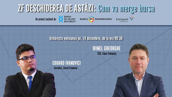ZF DESCHIDEREA DE ASTĂZI. Cum va merge bursa. Urmăriţi o discuţie joi, 18 decembrie 2025, ora 09.30 cu Irinel Gheorghe, CEO, Sipex Company