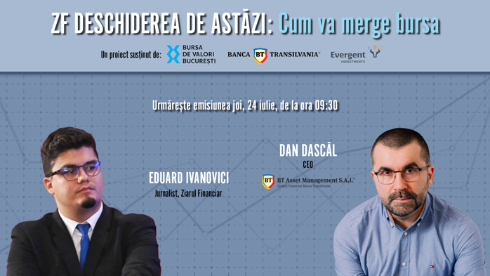 ZF DESCHIDEREA DE ASTĂZI. Cum va merge bursa. Urmăriţi o discuţie joi, 24 iulie 2025, ora 09.30 cu Dan Dascăl, CEO al BT Asset Management
