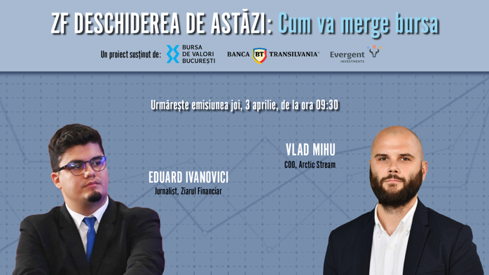 ZF DESCHIDEREA DE ASTĂZI. Cum va merge bursa. Urmăriţi o discuţie joi, 3 aprilie 2025, ora 09.30 cu Vlad Mihu, COO Arctic Stream