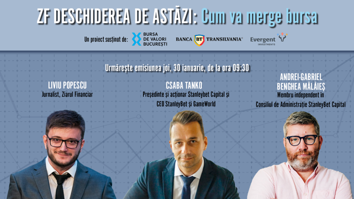 ZF DESCHIDEREA DE ASTĂZI. Cum va merge bursa. Urmăriţi o discuţie joi, 30 ianuarie 2025, ora 09.30, cu Csaba Tanko, Preşedinte şi acţionar Stanleybet Capital şi CEO StanleyBet şi GameWorld şi Andrei-Gabriel Benghea Mălăieş, Membru independent în Consiliul de Administraţie StanleyBet Capital