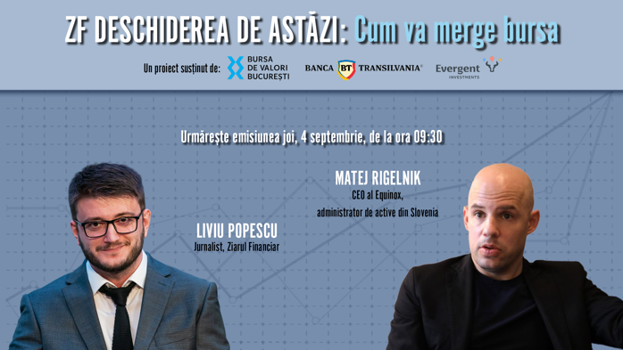 ZF DESCHIDEREA DE ASTĂZI. Cum va merge bursa. Urmăriţi o discuţie joi, 4 septembrie 2025, ora 09.30 cu Matej Rigelnik, CEO Equinox, administrator de active din Slovenia