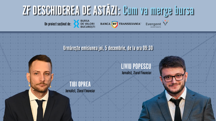 ZF DESCHIDEREA DE ASTĂZI. Cum va merge bursa. Urmăriţi o discuţie joi, 5 decembrie 2024, ora 09.30 cu Liviu Popescu şi Tibi Oprea, jurnalişti Ziarul Financiar