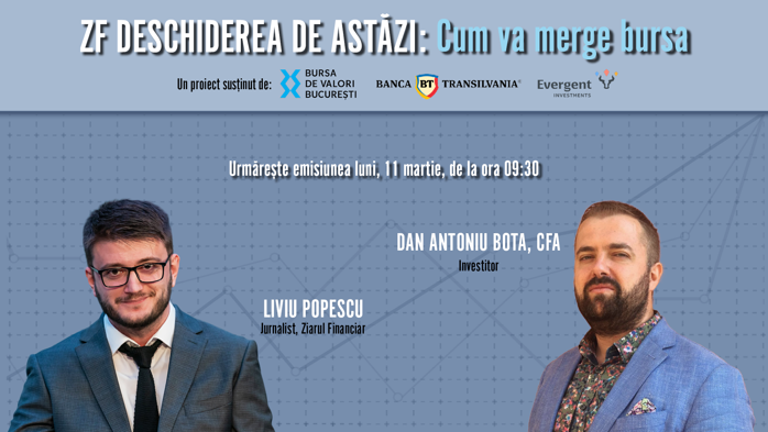 ZF DESCHIDEREA DE ASTĂZI. Cum va merge bursa. Urmăriţi o discuţie luni, 11 martie 2024, ora 09.30 cu Dan Antoniu Bota, CFA, investitor
