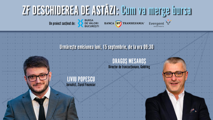 ZF DESCHIDEREA DE ASTĂZI. Cum va merge bursa. Urmăriţi o discuţie luni, 15 septembrie 2025, ora 09.30 cu Dragoş Mesaroş, Director de tranzacţionare al Goldring