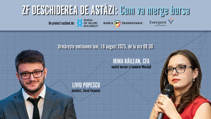 ZF DESCHIDEREA DE ASTĂZI. Cum va merge bursa. Urmăriţi o discuţie luni, 18 august 2025, ora 09:30 cu Irina Răilean, CFA, analist bursier şi fondator Mosaiq8