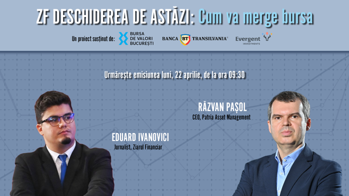 ZF DESCHIDEREA DE ASTĂZI. Cum va merge bursa. Urmăriţi o discuţie luni, 22 aprilie 2024, ora 09.30 cu Răzvan Paşol, CEO Patria Asset Management