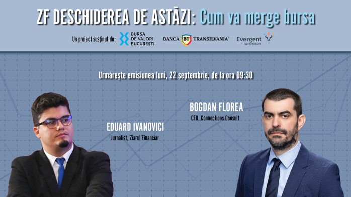 ZF DESCHIDEREA DE ASTĂZI. Cum va merge bursa. Urmăriţi o discuţie luni, 22 septembrie 2025, ora 09.30 cu Bogdan Florea, CEO Connections Consult
