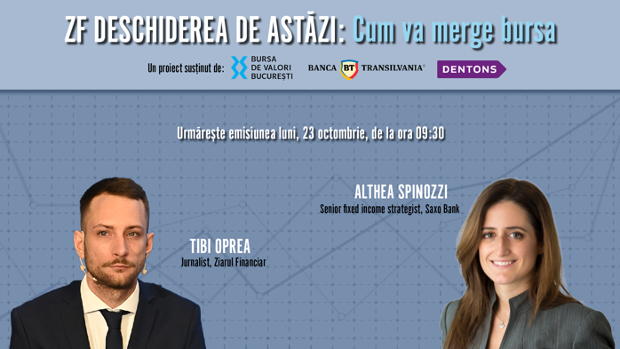 ZF DESCHIDEREA DE ASTĂZI. Cum va merge bursa. Urmăriţi o discuţie luni, 23 octombrie 2023, ora 09.30 cu Althea Spinozzi, senior fixed income strategist, Saxo Bank
