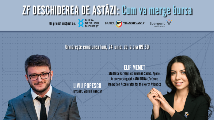 ZF DESCHIDEREA DE ASTĂZI. Cum va merge bursa. Urmăriţi o discuţie luni, 24 iunie 2024, ora 09.30 cu ​Elif Memet, studentă Harvard, ex Goldman Sachs, Apollo, în prezent angajat NATO DIANA (Defence Innovation Accelerator for the North Atlantic)