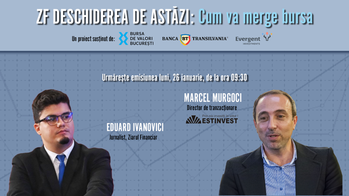 ZF DESCHIDEREA DE ASTĂZI. Cum va merge bursa. Urmăriţi o discuţie luni, 26 ianuarie 2026, ora 09.30 cu Marcel Murgoci, Director de tranzacţionare, Estinvest