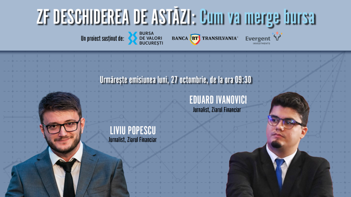 ZF DESCHIDEREA DE ASTĂZI. Cum va merge bursa. Urmăriţi o discuţie luni, 27 octombrie 2025, ora 09.30 cu Liviu Popescu şi Eduard Ivanovici, jurnalişti Ziarul Financiar