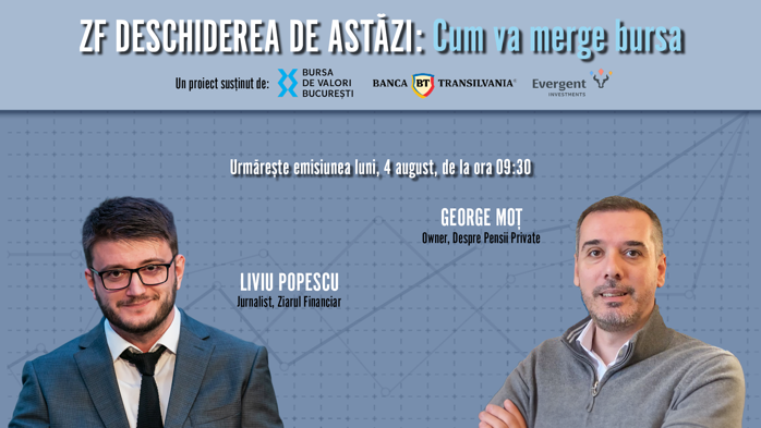 ZF DESCHIDEREA DE ASTĂZI. Cum va merge bursa. Urmăriţi o discuţie luni, 4 august 2025, ora 09.30 cu GEORGE MOŢ, Owner, Despre Pensii Private