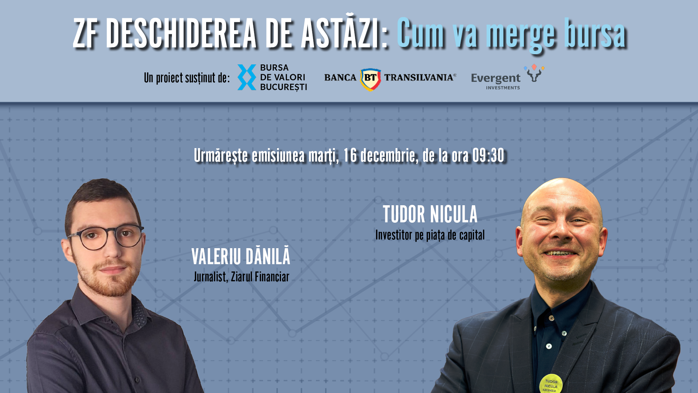 ZF DESCHIDEREA DE ASTĂZI. Cum va merge bursa. Urmăriţi o discuţie marţi, 16 decembrie 2025, ora 09.30 cu Tudor Nicula, investitor pe piaţa de capital