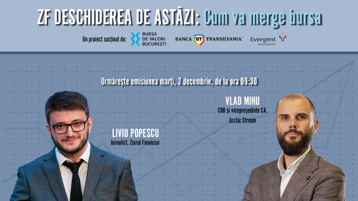 ZF DESCHIDEREA DE ASTĂZI. Cum va merge bursa. Urmăriţi o discuţie marţi, 2 decembrie 2025, ora 09.30 cu Vlad Mihu, COO şi vicepreşedinte CA, Arctic Stream