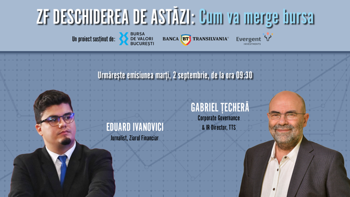 ZF DESCHIDEREA DE ASTĂZI. Cum va merge bursa. Urmăriţi o discuţie marţi, 2 septembrie 2025, ora 09.30 cu Gabriel Ţecheră, director guvernanţă corporativă şi relaţii cu investitorii, TTS