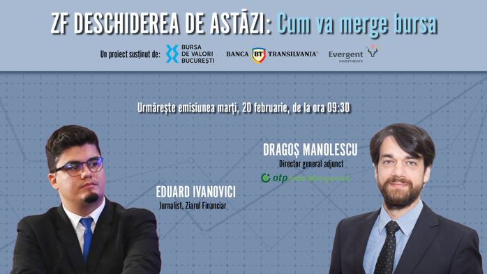 ZF DESCHIDEREA DE ASTĂZI. Cum va merge bursa. Urmăriţi o discuţie marţi, 20 februarie 2024, ora 09.30 cu Dragoş Manolescu, director general adjunct al OTP Asset Management