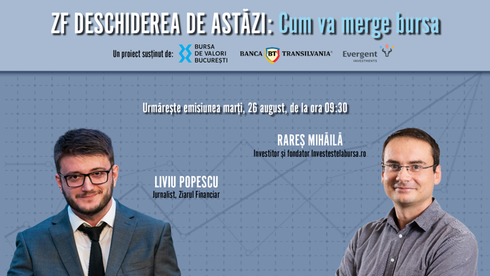 ZF DESCHIDEREA DE ASTĂZI. Cum va merge bursa. Urmăriţi o discuţie marţi, 26 august 2025, ora 09.30 cu Rareş Mihăilă, investitor