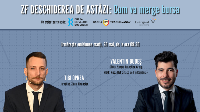 ZF DESCHIDEREA DE ASTĂZI. Cum va merge bursa. Urmăriţi o discuţie marţi, 28 mai 2024, ora 09.30 cu Valentin Budeş, CFO al Sphera Franchise Group (KFC, Pizza Hut şi Taco Bell în România)