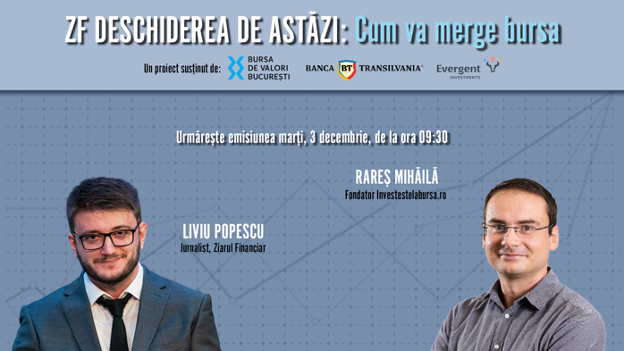 ZF DESCHIDEREA DE ASTĂZI. Cum va merge bursa. Urmăriţi o discuţie marţi, 3 decembrie 2024, ora 09.30 cu Rareş Mihăilă, fondator Investestelabursa.ro