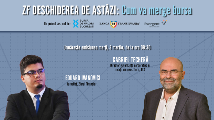 ZF DESCHIDEREA DE ASTĂZI. Cum va merge bursa. Urmăriţi o discuţie marţi, 3 martie 2026, ora 09.30 cu Gabriel Ţecheră, director guvernanţă corporativă şi relaţii cu investitorii, TTS