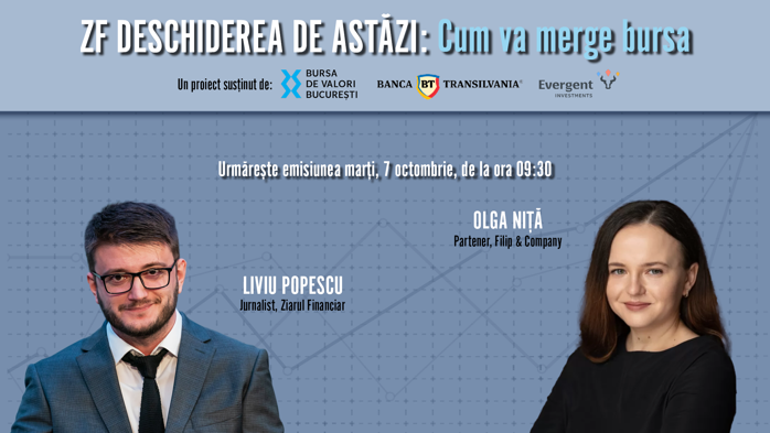 ZF DESCHIDEREA DE ASTĂZI. Cum va merge bursa. Urmăriţi o discuţie marţi, 7 octombrie 2025, ora 09.30 cu Olga Niţă, partener Filip & Company, unul dintre cei mai activi consultanţi juridici în tranzacţiile de pe piaţa locală şi regională