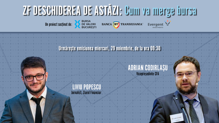 ZF DESCHIDEREA DE ASTĂZI. Cum va merge bursa. Urmăriţi o discuţie miercuri, 28 noiembrie 2023, ora 09.30 cu Adrian Codirlaşu, vicepreşedinte CFA