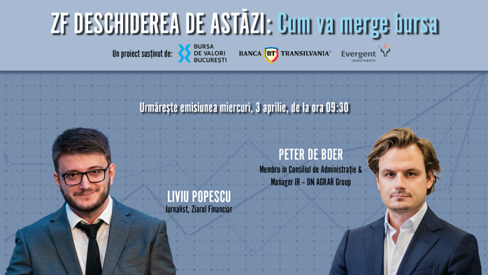 ZF DESCHIDEREA DE ASTĂZI. Cum va merge bursa. Urmăriţi o discuţie miercuri, 3 aprilie 2024, ora 09.30 cu Peter de Boer, Membru în Consiliul de Administraţie & Manager IR – DN AGRAR Group
