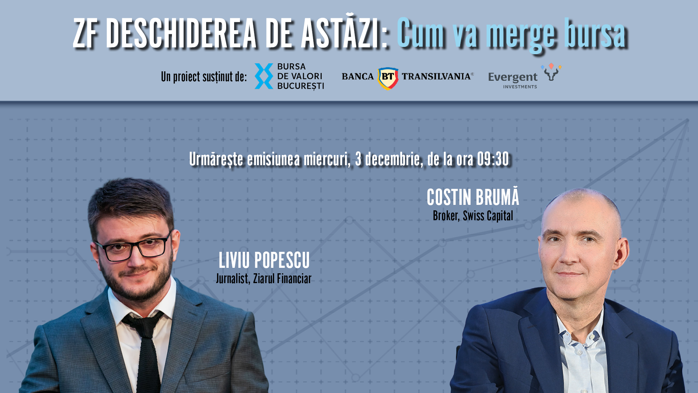 ZF DESCHIDEREA DE ASTĂZI. Cum va merge bursa. Urmăriţi o discuţie miercuri, 3 decembrie 2025, ora 09.30 cu Costin Brumă, broker, Swiss Capital
