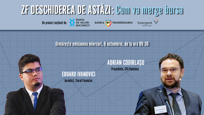 ZF DESCHIDEREA DE ASTĂZI. Cum va merge bursa. Urmăriţi o discuţie miercuri, 8 octombrie 2025, ora 09.30 cu Adrian Codirlaşu, preşedinte, CFA România