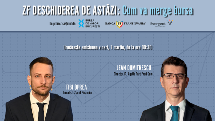 ZF DESCHIDEREA DE ASTĂZI. Cum va merge bursa. Urmăriţi o discuţie vineri, 1 martie 2024, ora 09.30 cu Jean Dumitrescu, Director IR, Aquila Part Prod Com