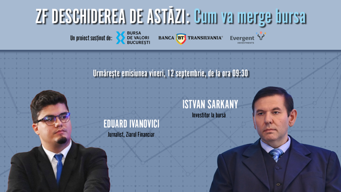 ZF DESCHIDEREA DE ASTĂZI. Cum va merge bursa. Urmăriţi o discuţie vineri, 12 septembrie 2025, ora 09.30 cu Istvan Sarkany, investitor la bursă