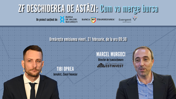 ZF DESCHIDEREA DE ASTĂZI. Cum va merge bursa. Urmăriţi o discuţie vineri, 21 februarie 2025, ora 09.30 cu Marcel Murgoci, Director de tranzacţionare, Estinvest