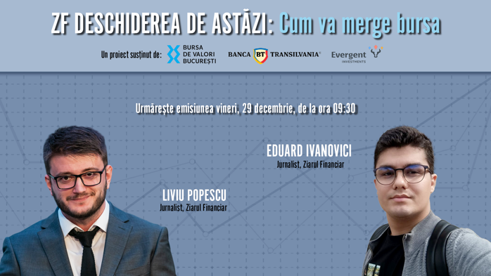 ZF DESCHIDEREA DE ASTĂZI. Cum va merge bursa. Urmăriţi o discuţie vineri, 29 decembrie 2023, ora 09.30 cu Eduard Ivanovici, jurnalist Ziarul Financiar