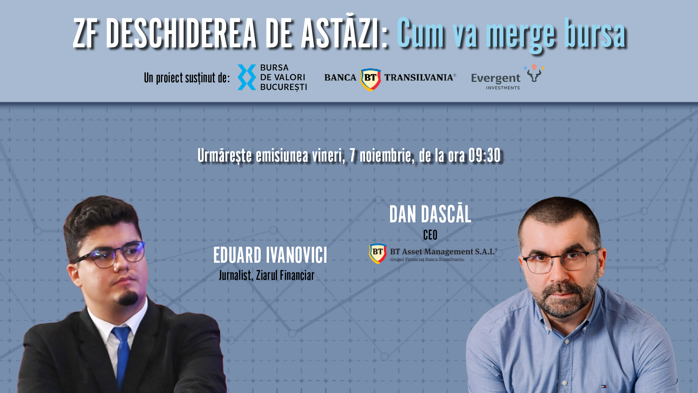 ZF DESCHIDEREA DE ASTĂZI. Cum va merge bursa. Urmăriţi o discuţie vineri, 7 noiembrie 2025, ora 09.30 cu Dan Dascăl, CEO al BT Asset Management
