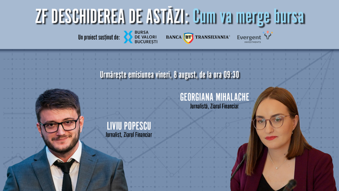 ZF DESCHIDEREA DE ASTĂZI. Cum va merge bursa. Urmăriţi o discuţie vineri, 8 august 2025, ora 09.30 cu Georgiana Mihalache, jurnalistă Ziarul Fiananciar