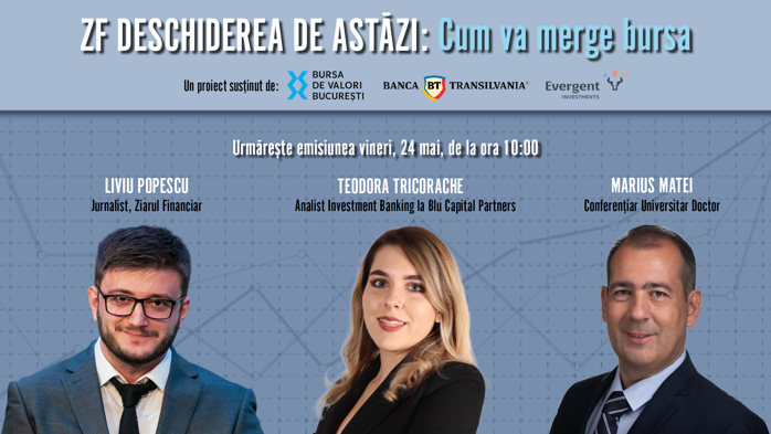 ZF DESCHIDEREA DE ASTĂZI. Cum va merge bursa. Urmăriţi vineri, 24 mai 2024, ora 09.30 o discuţie cu Teodora Tricorache, Analist Investment Banking la Blu Capital Partners şi Marius Matei, Conferenţiar Universitar Doctor