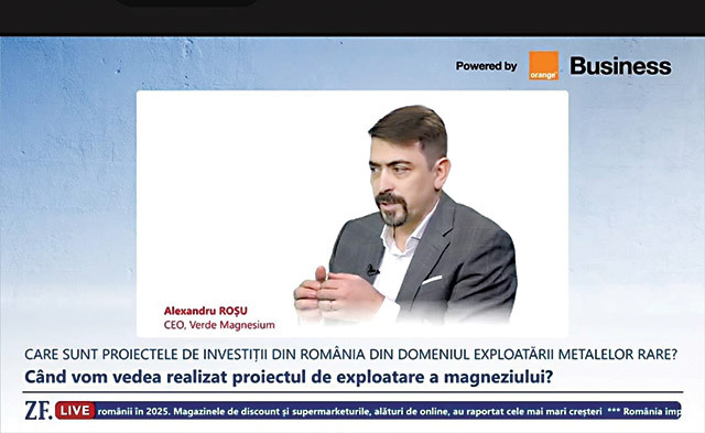 ZF Live. Alexandru Roşu, CEO al Verde Magnesium, o companie care vrea să exploateze magneziu în România, o investiţie de 1 mld. dolari: Vrem să începem anul acesta construcţia fabricii-mamă în Beiuş, judeţul Bihor, o investiţie de 23-25 mil. euro