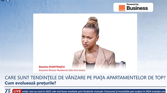 Cel mai scump apartament vândut în 2023 de către dezvoltatorul imobiliar One United a depăşit suma de trei milioane de euro. Pe segmentul rezidenţial, anul trecut vânzările One United au totalizat peste 274 milioane de euro, subliniază Beatrice Dumitraşcu, Executive Director Residential Sales One United.