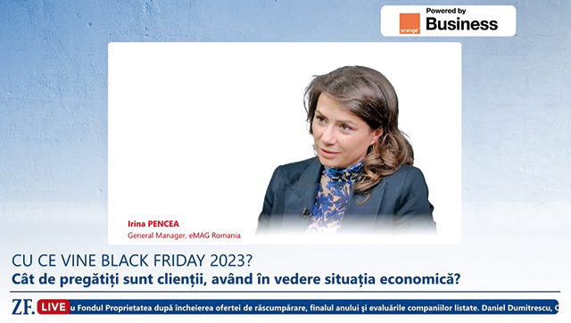 ZF Live. Irina Pencea, general manager la eMAG România: Suma de bani pe care românii au pregătit-o pentru cumpărături de Black Friday a depăşit pragul de 2.850 lei, plus 11% faţă de 2022. Estimăm vânzări de 680 mil. lei în campania din acest an
