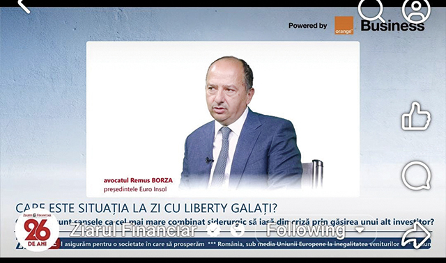 ZF Live. Remus Borza, administrator concordativ: Care este situaţia la zi la Liberty? Care sunt şansele să iasă combinatul din criză? Situaţie critică la Liberty Galaţi, cel mai mare combinat siderurgic: Suntem într-un blocaj. Am venit cu patru variante de salvare a combinatului dar niciuna nu a fost agreată. Guvernul ar trebui să accepte vânzarea accelerată a core-businessului