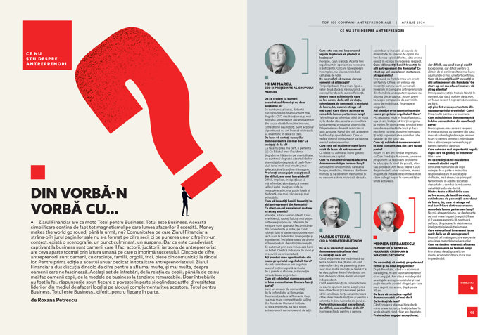 ♦ Pentru prima ediţie a acestui anuar dedicat în totalitate antreprenoriatului, Ziarul Financiar a dus discuţia dincolo de cifre pentru a afla mai multe, şi mai multe, despre oamenii care ne fascinează ♦ Acelaşi set de întrebări, de la relaţia cu copiii până la de ce nu mai fac oamenii copii, de la modele de business la tendinţe remarcabile ♦ Doar întrebările au fost la fel, răspunsurile spun fiecare o poveste în parte şi oglindesc astfel diversitatea liderilor din mediul de afaceri local şi pe alocuri complementaritatea acestora ♦ Totul pentru Business. Totul este Business… diferit, pentru fiecare în parte.