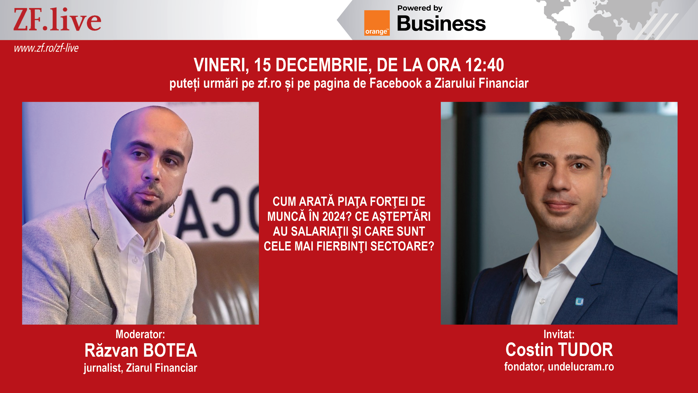 ZFLive: Cum arată piaţa forţei de muncă în 2024? Ce aşteptări au salariaţii şi care sunt cele mai fierbinţi sectoare? Urmăriţi ZF Live vineri, 15 decembrie, ora 12:40 cu Costin TUDOR - fondator, undelucram.ro