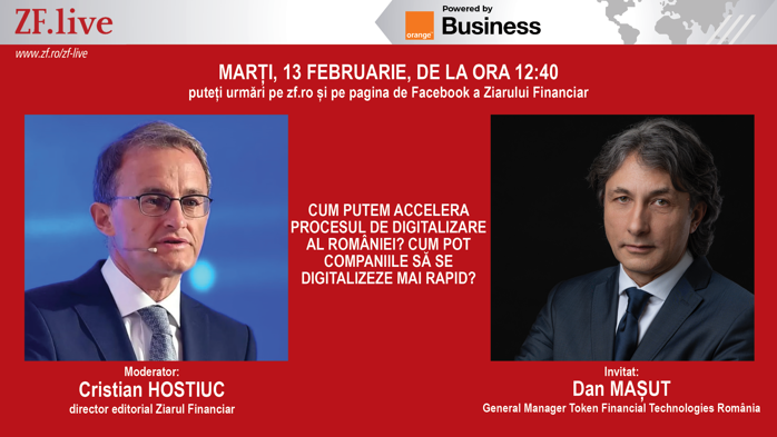 ZFLive: Cum putem accelera procesul de digitalizare al României? Cum pot companiile să se digitalizeze mai rapid? Urmăriţi emisiunea ZF Live de marţi, 13 februarie, de la ora 12:40, cu Dan Maşut, General Manager Token Financial Technologies România